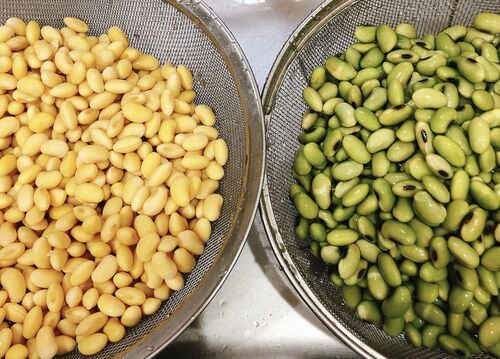 青大豆(ひたし豆)を使って 味噌を仕込んだ。 画像は水に浸した豆をザルに上げたところ。 一緒に仕込んでいるのは大豆の味噌。 こちらが使った ひたし豆(青大豆) 茹で上がった2種類の豆。 青大豆、だいぶ色落ちしちゃったなぁ。 仕上がった青大豆の味噌…